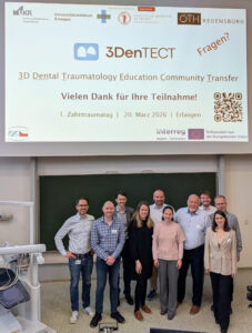 Im Rahmen des EU-co-finanzierten Projektes 3DenTECT (3D Dental Traumatology Education Community Transfer) zur Verbesserung der Versorgung von Zahnunfällen in der bayerisch-tschechischen Grenzregion fand am Freitag, den 20.03.26, der erste projektbezogene Zahntraumatag in Erlangen statt. Insgesamt über 75 Teilnehmende waren vor Ort in der Zahnklinik Erlangen oder online per Videoübertragung dabei und lauschten spannenden Fachvorträgen des Projektteams. Nach Eröffnung der Veranstaltung durch Frau Prof. Galler (Uniklinikum Erlangen), erläuterten Herr Prof. Schratzenstaller (OTH Regensburg) und MUDr. Dr. Daniel Hrušák (Fakultní nemocnice Plzeň, Tschechien) die Hintergründe für die Entwicklung und Notwendigkeit des Projektes. Im Anschluss stellte Frau PD Dr. Maier (Uniklinikum Erlangen) Epidemiologie und Verletzungsarten von Zahnunfällen dar, Herr Prof. Widbiller (Uniklinikum Regensburg) gab Tipps und Tricks zur Erstversorgung und Frau Prof. Galler demonstrierte anschaulich mögliche Spätfolgen und Komplikationen dentaler Traumata und wie diese zu vermeiden sind. Mit einem Ausblick auf die nächsten Schritte des Projektes schloss Alexander Raab (OTH Regensburg) die kurzweilige, lehrreiche Veranstaltung ab (weitere Infos zum Projekt finden Sie unter www.3DenTECT.eu).